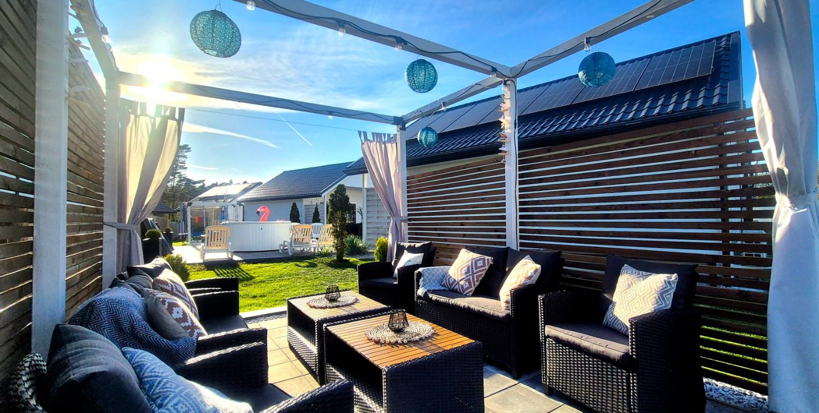 wygodny zadaszony taras z zestawem wypoczynkowym